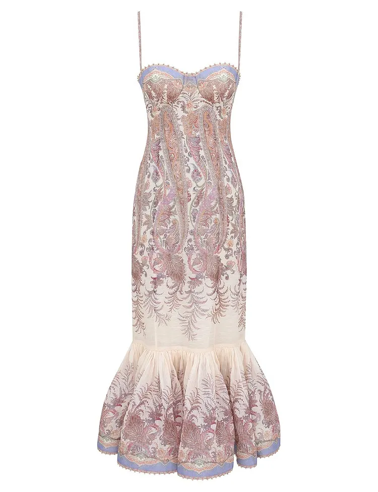 The Alchemy Gown in Cream Paisley from our Spring 2026 Collection, Kindred Spirit. A silk-linen midi dress featuring a sweetheart neckline, hand beaded trim on the top edge bust and hem, moulded cups on the bodice, finished with a shirred back panel and flared silhouette.