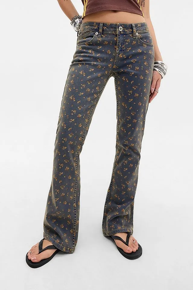 Jeans mit floral bedrucktem Muster von BDG, entworfen mit einer schlanken, ausgestellten Silhouette und einer tief sitzenden, niedrigen Taille. Stretch-Denim-Stil mit niedrig sitzender Taille, G¨¹rtelschlaufen und einem Knopf- sowie Rei?verschlussverschluss. Nur bei UO.