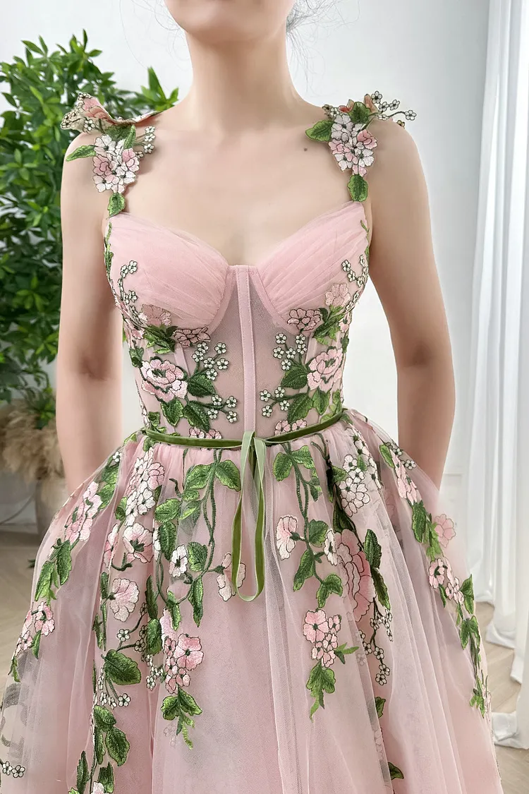 Corset V Neck Floral Applique Midi Pink Dress