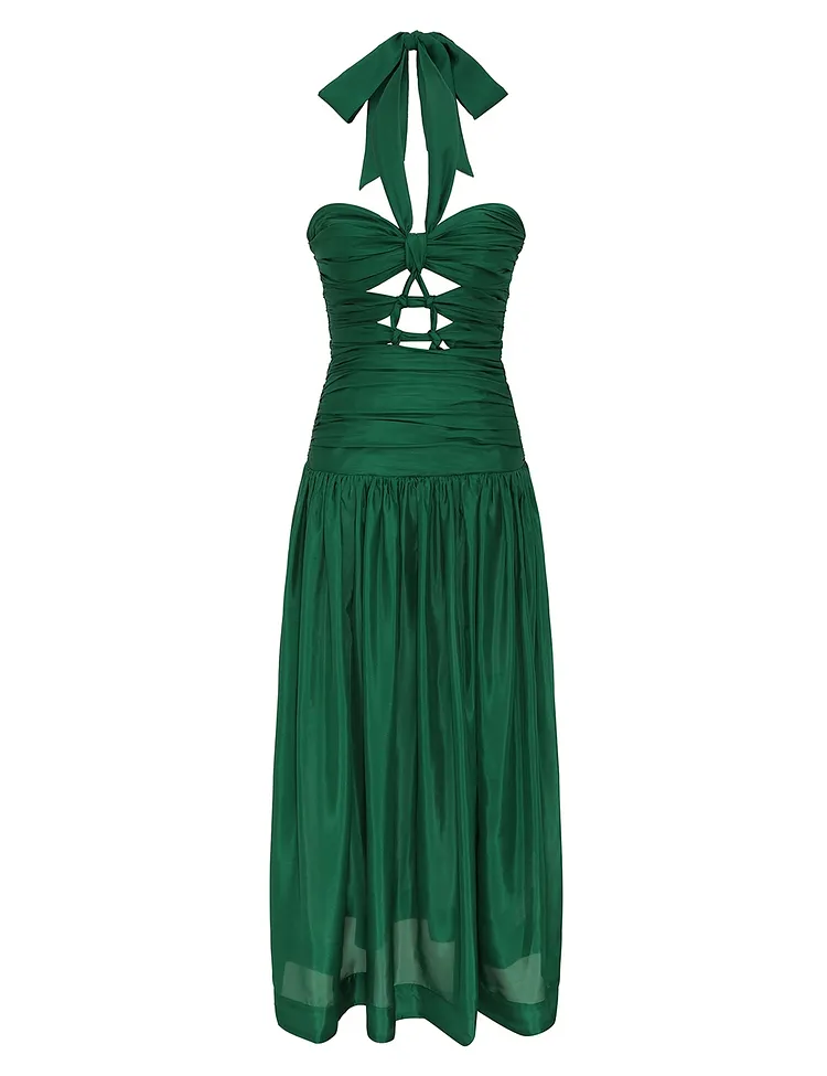 The Daylight Knot Midi in Emerald from our Resort Swim 2026 Collection. A silk midi dress featuring a halter neck-tie, fitted bodice with knot detailing, finished with a pleated skirt and invisible centre back zip closure.