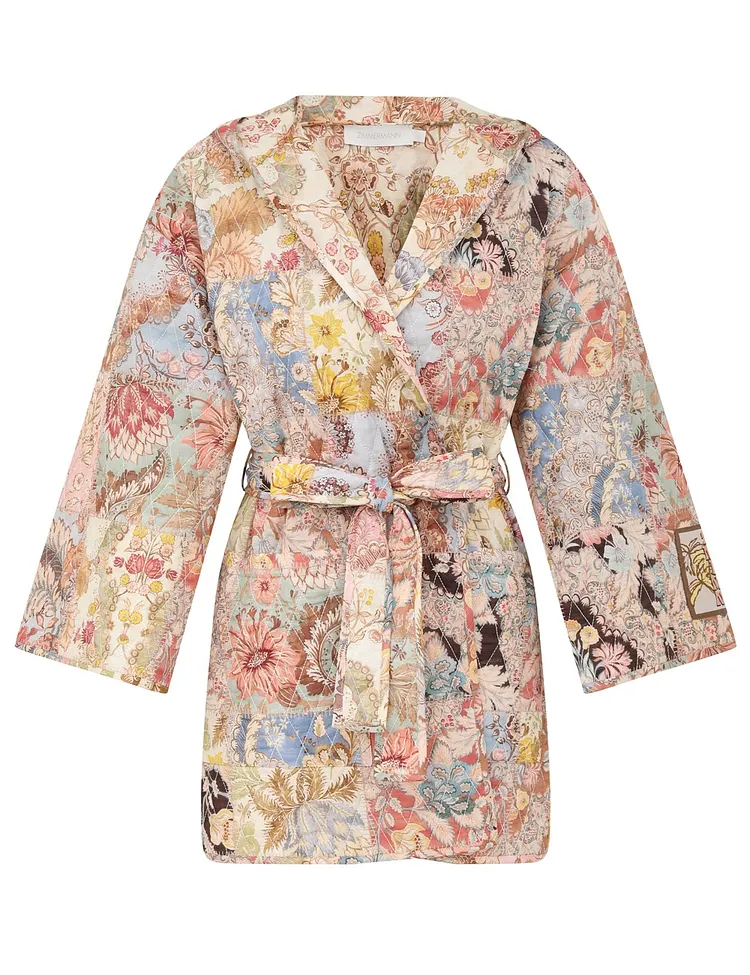 The Daylight Quilted Robe in Patch Multi from our Resort Swim 2026 Collection. A cotton quilted mini robe featuring a plunging V-neckline, self-tie waist belt and a functional hood.