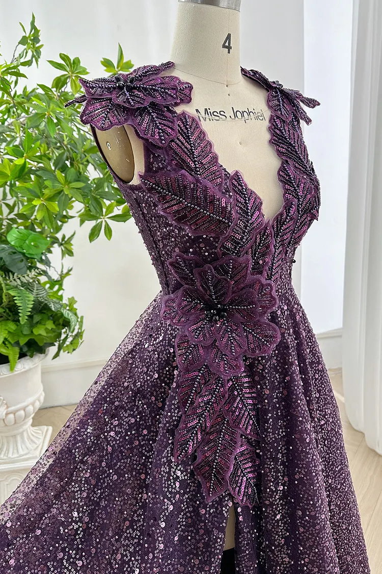 This stunning deep plum evening gown features exquisite 3D floral and leaf appliques over a glittering sequin base. The V-neckline and sleeveless silhouette beautifully flatter the shoulders, while the A-line skirt flows gracefully to the floor. The corset lace-up back ensures a perfect fit. Ideal for women seeking a statement-making look for formal events, galas, or evening receptions.