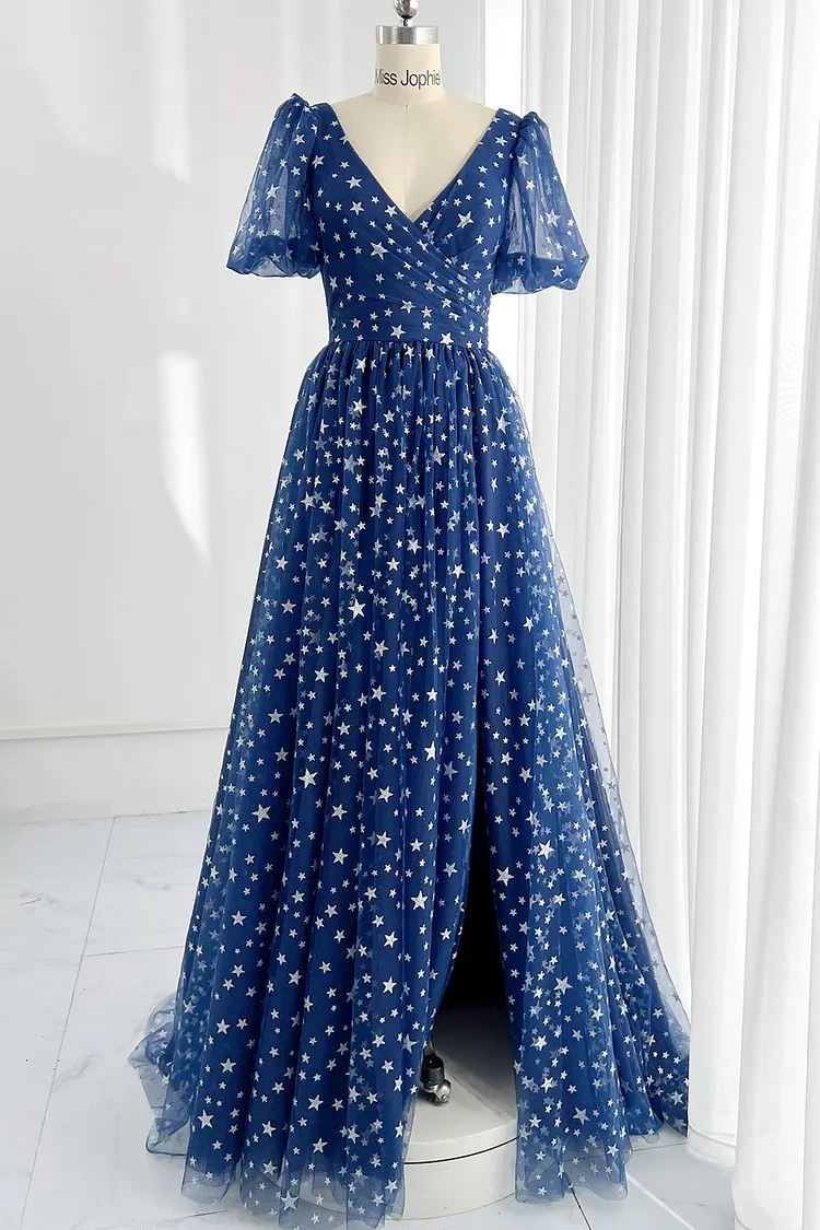 Puff Sleeves V Neck Dark Navy Prom Dress