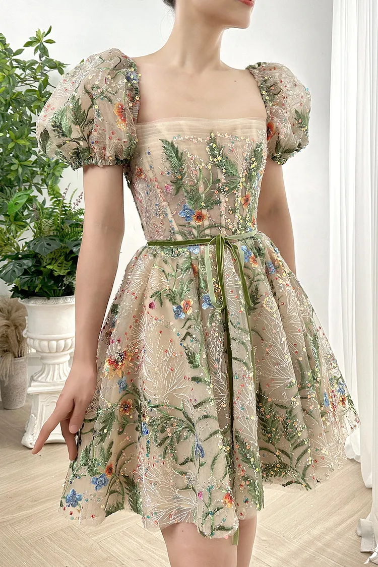 Short Puff Sleeves Corset Floral Embroidery Beaded Mini Dress