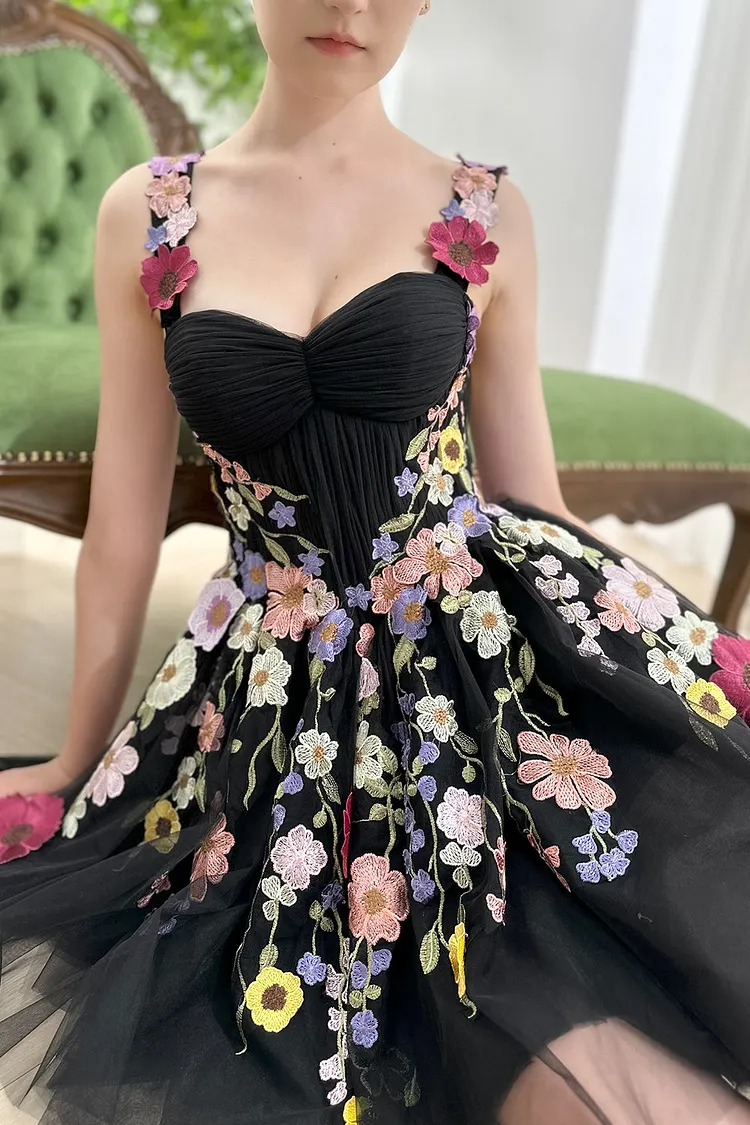 - Boost your confidence and showcase your feminine side with this stunning Straps Corset Floral Applique Mini Dress. Featuring delicate floral applique, this dress is perfect for any occasion. The corset design accentuates your curves, making you feel comfortable and confident all day long. Perfect for a romantic date or a night out with friends.