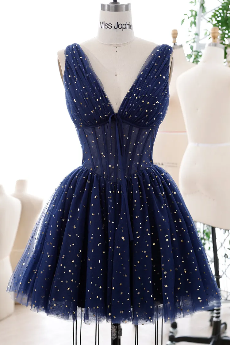 Straps V Neck Star Tulle Mini Dress with Lace Up Back